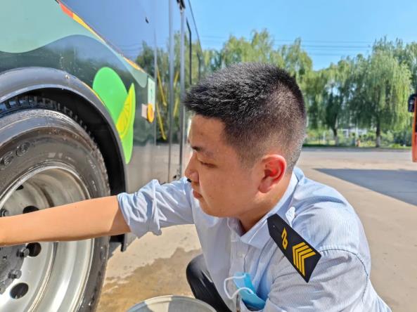 “衣服都濕透了,別弄了,先歇歇吧?!薄皼]事,我把衛(wèi)生弄好了就去?!?.....眼前這個小伙是603路的張?zhí)祧?,趁著休停時間,他一邊用布擦拭著輪轂,一邊用手擦拭臉上的汗珠。忙完后,發(fā)現(xiàn)發(fā)車時間已到,他立即回到駕駛室,等待乘客的到來和發(fā)班指令,沒來得及喝上一口水。