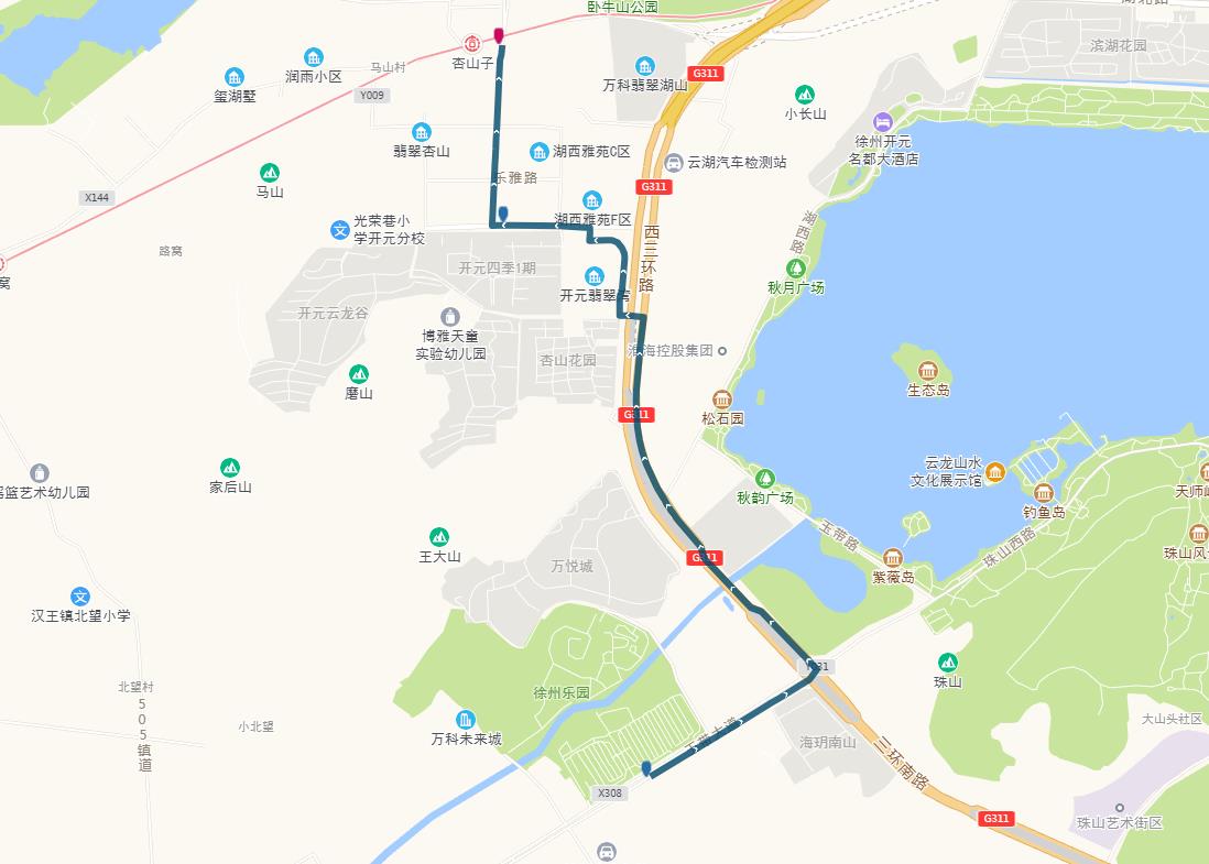 線路站點(diǎn):徐州樂(lè)園、杏山花園、開(kāi)元路東口、開(kāi)元路環(huán)島、菁英路、杏山子地鐵站