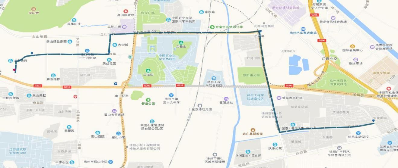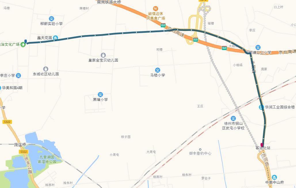 線路站點(diǎn):山南小鎮(zhèn),山水龍瑞,馬場(chǎng)湖路口,馬場(chǎng)湖,怡康花園,后勤學(xué)院北,誠(chéng)坤鋼材市場(chǎng),蘇堤北路立交橋(西),蘇堤北路立交橋(東),蘇堤路小學(xué),永業(yè)花園小區(qū),江蘇四監(jiān),銅沛路東口,中山北路立交橋