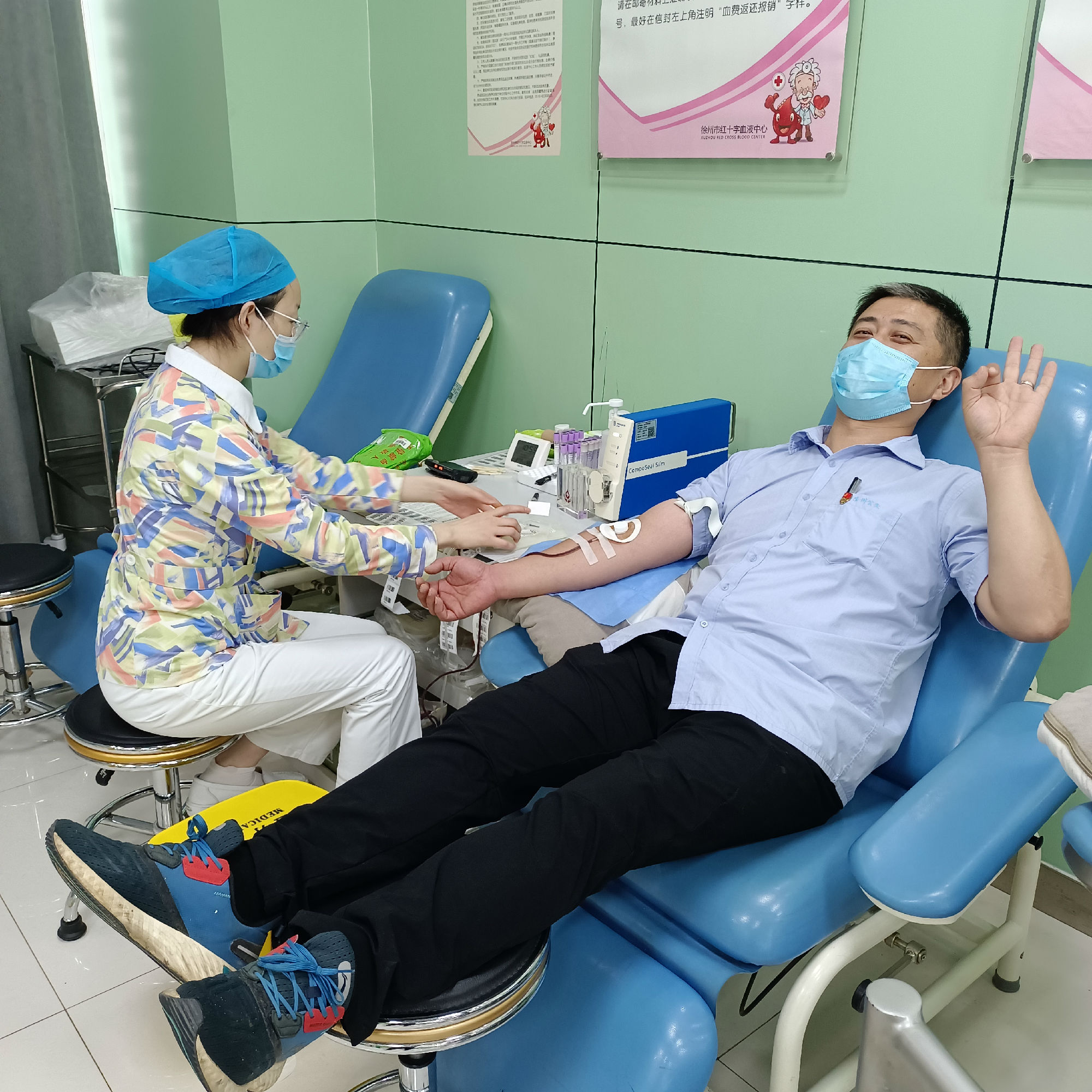 到達(dá)獻(xiàn)血站后,在血站工作人員的指導(dǎo)協(xié)助下,他們填寫了獻(xiàn)血登記表,待符合獻(xiàn)血標(biāo)準(zhǔn)后二人擼起衣袖進(jìn)行采血......